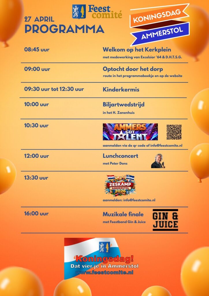 We maken er een feestelijke dag van met muziek, gezelligheid en, na terugkeer vorig jaar, ons eigen open podium: Ammers Got Talent!